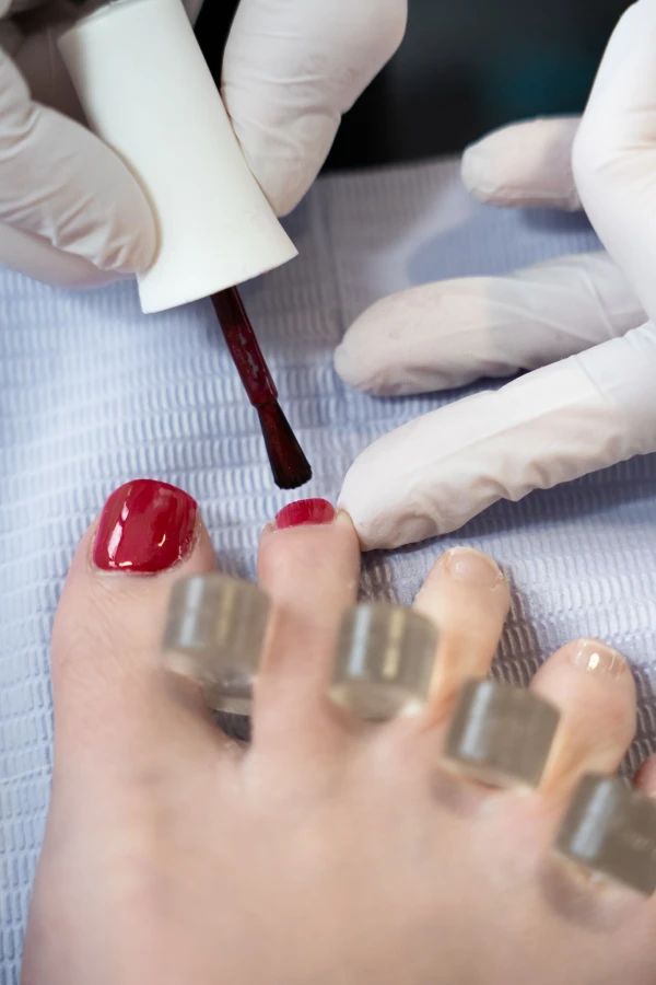 Pedicure behandeling zoals omschreven aangevuld met gellak. Gellak op de nagels is een lak die onder een UV lamp droogt. Deze lak is dikker zodat oneffenheden mooi worden weggewerkt en hij glanst langdurig. De lak blijft veel langer zitten dan gewone lak en is er alleen af te halen door een combinatie van nagellak remover met aceton en door het open vijlen van de toplaag.